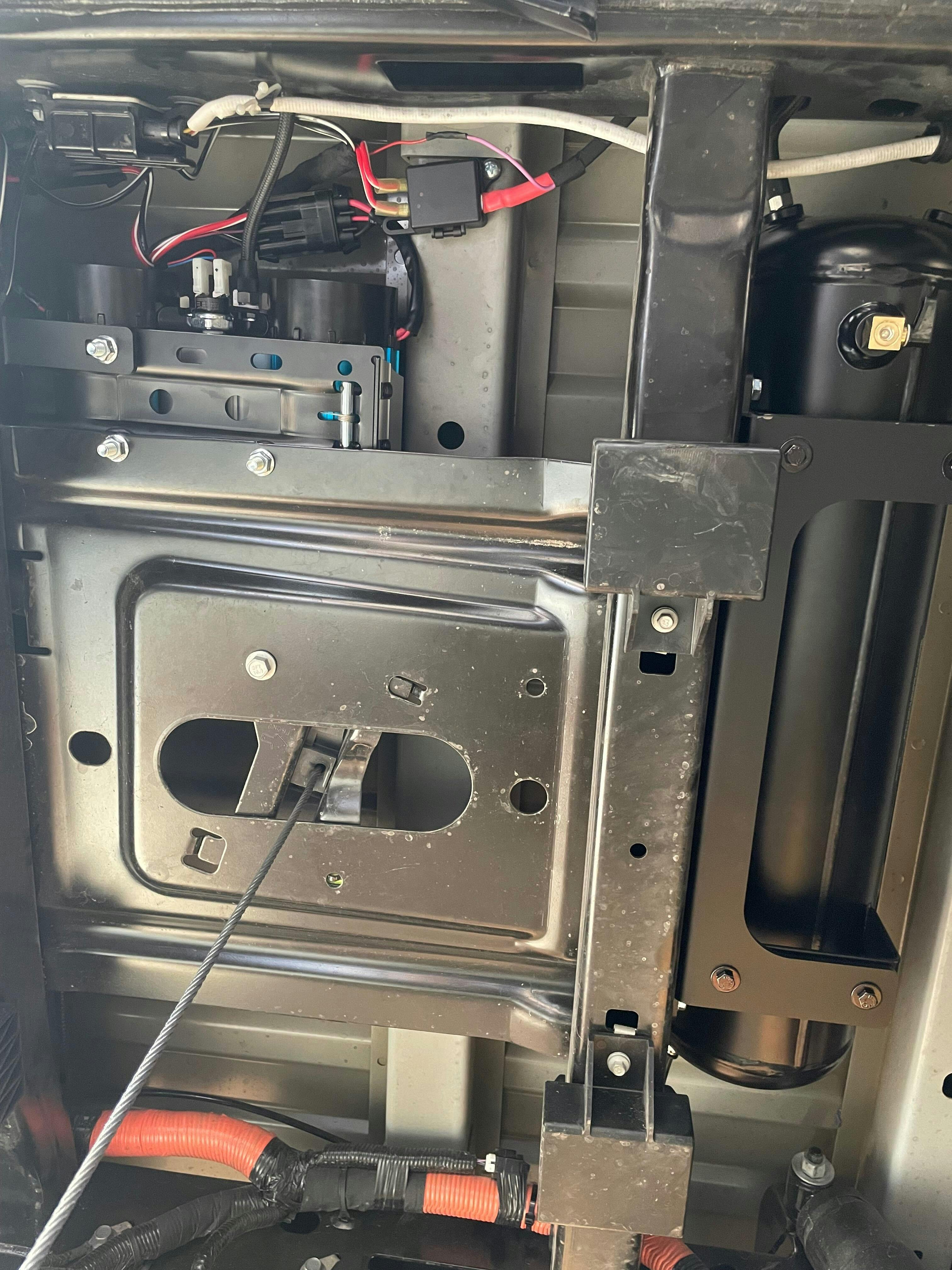If you own one of these trucks you know there is no place to mount the twin ARB compressor under the hood, Ford likes to use every square inch of space available, the brushless compressor runs very hot and is noisy compared to the previous design, for these reasons we are mounting the brushless compressor and 2.5 gallon air tank above the rear spare tire.